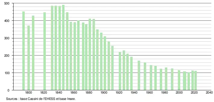 L'évolution du nombre d'habitants est connue à travers les recensements de la population effectués dans la commune depuis 1793. Pour les communes de moins de 10 000 habitants, une enquête de recensement portant sur toute la population est réalisée tous les cinq ans, les populations légales des années intermédiaires étant quant à elles estimées par interpolation ou extrapolation[21]. Pour la commune, le premier recensement exhaustif entrant dans le cadre du nouveau dispositif a été réalisé en 2007[22].