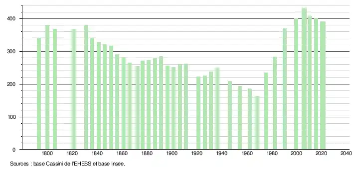 L'évolution du nombre d'habitants est connue à travers les recensements de la population effectués dans la commune depuis 1793. Pour les communes de moins de 10 000 habitants, une enquête de recensement portant sur toute la population est réalisée tous les cinq ans, les populations légales des années intermédiaires étant quant à elles estimées par interpolation ou extrapolation[35]. Pour la commune, le premier recensement exhaustif entrant dans le cadre du nouveau dispositif a été réalisé en 2005[36].