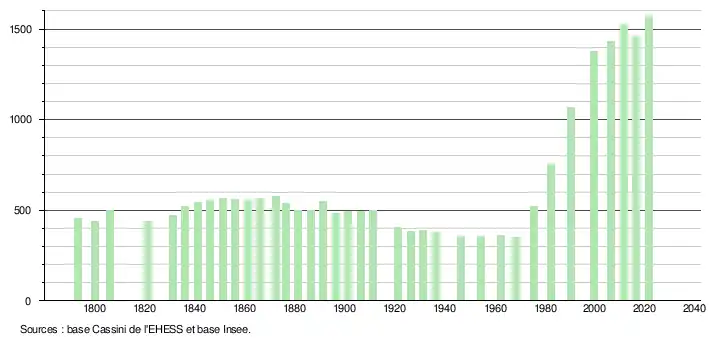 L'évolution du nombre d'habitants est connue à travers les recensements de la population effectués dans la commune depuis 1793. Pour les communes de moins de 10 000 habitants, une enquête de recensement portant sur toute la population est réalisée tous les cinq ans, les populations légales des années intermédiaires étant quant à elles estimées par interpolation ou extrapolation[25]. Pour la commune, le premier recensement exhaustif entrant dans le cadre du nouveau dispositif a été réalisé en 2006[26].
