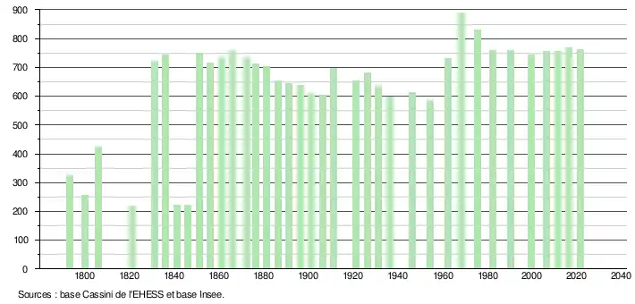 L'évolution du nombre d'habitants est connue à travers les recensements de la population effectués dans la commune depuis 1793. Pour les communes de moins de 10 000 habitants, une enquête de recensement portant sur toute la population est réalisée tous les cinq ans, les populations légales des années intermédiaires étant quant à elles estimées par interpolation ou extrapolation[19]. Pour la commune, le premier recensement exhaustif entrant dans le cadre du nouveau dispositif a été réalisé en 2006[20].