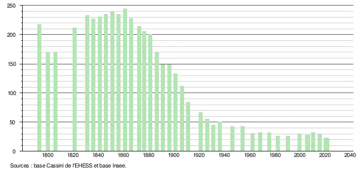 L'évolution du nombre d'habitants est connue à travers les recensements de la population effectués dans la commune depuis 1793. Pour les communes de moins de 10 000 habitants, une enquête de recensement portant sur toute la population est réalisée tous les cinq ans, les populations légales des années intermédiaires étant quant à elles estimées par interpolation ou extrapolation[19]. Pour la commune, le premier recensement exhaustif entrant dans le cadre du nouveau dispositif a été réalisé en 2005[20].