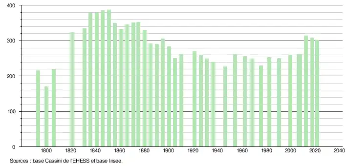 L'évolution du nombre d'habitants est connue à travers les recensements de la population effectués dans la commune depuis 1793. Pour les communes de moins de 10 000 habitants, une enquête de recensement portant sur toute la population est réalisée tous les cinq ans, les populations légales des années intermédiaires étant quant à elles estimées par interpolation ou extrapolation[19]. Pour la commune, le premier recensement exhaustif entrant dans le cadre du nouveau dispositif a été réalisé en 2007[20].