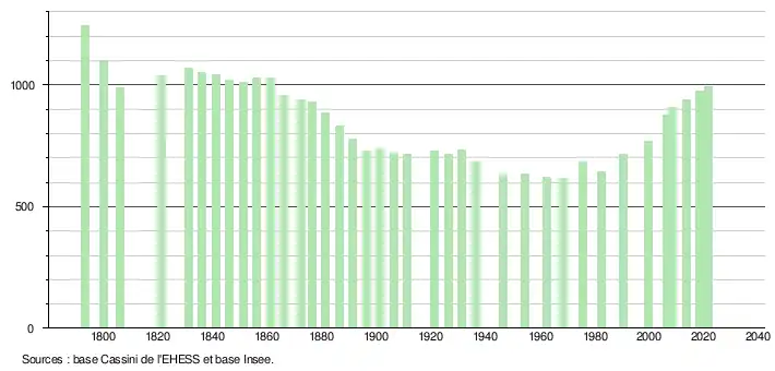 L'évolution du nombre d'habitants est connue à travers les recensements de la population effectués dans la commune depuis 1793. Pour les communes de moins de 10 000 habitants, une enquête de recensement portant sur toute la population est réalisée tous les cinq ans, les populations légales des années intermédiaires étant quant à elles estimées par interpolation ou extrapolation[16]. Pour la commune, le premier recensement exhaustif entrant dans le cadre du nouveau dispositif a été réalisé en 2008[17].