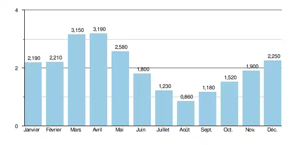 La rivière présente des fluctuations saisonnières de débit, avec des hautes eaux d'automne-hiver qui portent le débit mensuel moyen au niveau de 2,19 à 3,15 m3/s de décembre à mai inclus (avec un maximum en mars-avril). Dès lors s'amorce une baisse progressive aboutissant aux basses eaux d'été (avec un minimum de 0,86 m3/s en août)[2].