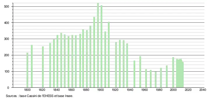 L'évolution du nombre d'habitants est connue à travers les recensements de la population effectués dans la commune depuis 1800. Pour les communes de moins de 10 000 habitants, une enquête de recensement portant sur toute la population est réalisée tous les cinq ans, les populations légales des années intermédiaires étant quant à elles estimées par interpolation ou extrapolation[17]. Pour la commune, le premier recensement exhaustif entrant dans le cadre du nouveau dispositif a été réalisé en 2004[18].