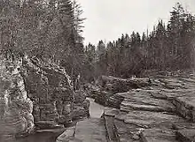 - 1,1 km vers le sud en traversant une série de rapides, jusqu'à la confluence de la rivière aux Pins (venant de l'ouest) ;