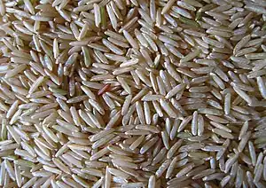 - le riz paddy (terme venant du malais padi, qui désigne le riz sur pied dans la rizière) est à l'état brut, c'est un « riz non décortiqué », qui a conservé sa balle après battage[5]. Il est aussi cultivé en aquariophilie, pour ses paramécies dans le germe du grain[6].
