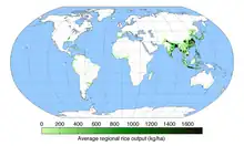 Près de 2 000 variétés de riz sont aujourd'hui cultivées. Les difficultés liées à la culture du riz font que, contrairement au blé, il est cultivé dans très peu de pays. Ainsi, près de 90 % de la production mondiale est fournie par l'Asie des moussons. À elles seules, les productions totales additionnées de la Chine et de l'Inde dépassent la moitié de la production mondiale. Cela s'explique notamment par les exigences du riz en matière climatique.
