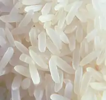 - le riz blanc, ou riz usiné, ou riz blanchi, dont le péricarpe et le germe ont été enlevés[5] : il ne reste quasiment que les réserves amylacées (l'endosperme).