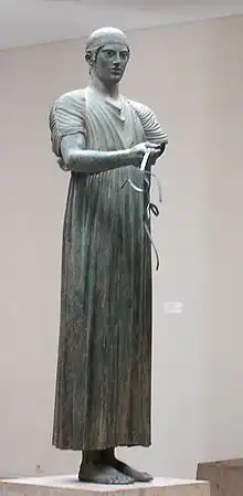 Le , Mariano Fortuny dépose un brevet à Paris sur ce vêtement, le brevet d'invention n° 408.629, intitulé « Genre de vêtement pour femmes ». Il y précise notamment qu'il s'agit d'une robe « consistant essentiellement en un fourreau ouvert à ses deux extrémités dont les bords sont rapprochés à la partie supérieure de manière une ouverture centrale d'encolure, deux ouvertures latérales pour les bras et deux ouvertures à bords rapprochés par un laçage s'étendant le long des bras avec des coulisses obliques […] pour permettre d'ajuster le dessous de la manche. »[6]. Cette robe doit son nom à l'aurige de Delphes, une célèbre sculpture de la Grèce antique, et l'un des cinq seuls grands bronzes qui nous soient parvenus de l'époque classique[2]. La robe rencontre le succès et se voit portée, entre autres, par Peggy Guggenheim, Luisa Casati et plusieurs artistes, mondaines ou riches héritières[1].