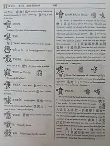 Le dictionnaire connu sous le nom de Morrison's Dictionnary (en), auquel Robert Morrison travailla pendant 16 ans[14], a été le premier dictionnaire chinois-anglais, anglais-chinois, devenu immédiatement un ouvrage de référence[28] considéré de plus comme très bien adapté à l'apprentissage de la langue chinoise[29]. Il est en grande partie basé sur le dictionnaire de caractères de Kangxi et sur un dictionnaire de rimes chinoises de la même époque, le Wuche Yunfu (chinois simplifié : 五车韵府 ; chinois traditionnel : 五車韻府 ; pinyin : )[29]. Cela signifie que ses notes tonales étaient celles du chinois moyen plutôt que celles réellement parlées à son époque. Étant donné les tuteurs dont il disposait, ses transcriptions reposaient sur le mandarin de Nankin plutôt que sur le dialecte de Pékin[30],[31].