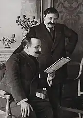 Gaston Arman de Caillavet et Robert de Flers, auteurs de la pièce de théâtre L'Habit vert, dessin d'Yves Marevéry, 1912.