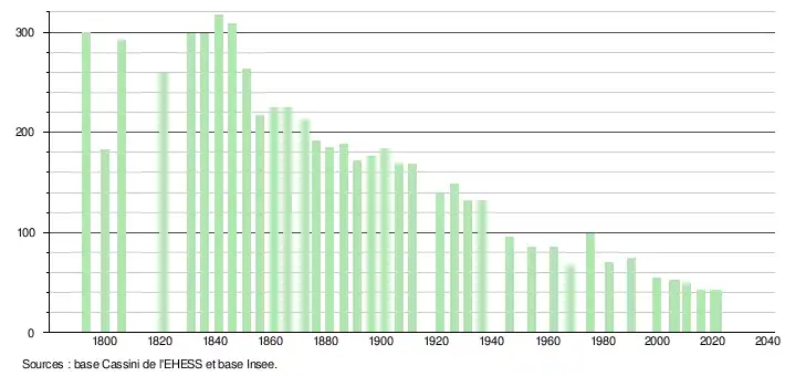 L'évolution du nombre d'habitants est connue à travers les recensements de la population effectués dans la commune depuis 1793. Pour les communes de moins de 10 000 habitants, une enquête de recensement portant sur toute la population est réalisée tous les cinq ans, les populations légales des années intermédiaires étant quant à elles estimées par interpolation ou extrapolation[18]. Pour la commune, le premier recensement exhaustif entrant dans le cadre du nouveau dispositif a été réalisé en 2005[19].
