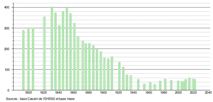 L'évolution du nombre d'habitants est connue à travers les recensements de la population effectués dans la commune depuis 1793. Pour les communes de moins de 10 000 habitants, une enquête de recensement portant sur toute la population est réalisée tous les cinq ans, les populations légales des années intermédiaires étant quant à elles estimées par interpolation ou extrapolation[19]. Pour la commune, le premier recensement exhaustif entrant dans le cadre du nouveau dispositif a été réalisé en 2004[20].