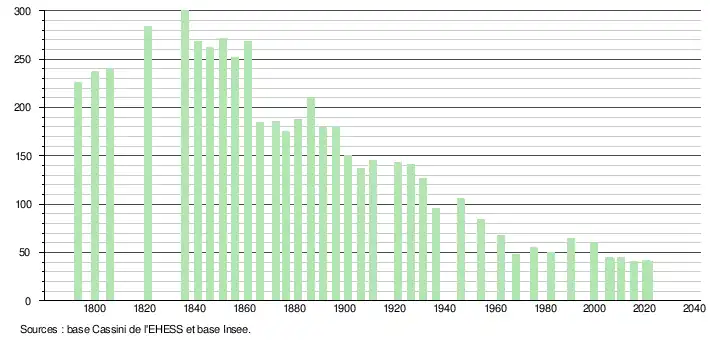L'évolution du nombre d'habitants est connue à travers les recensements de la population effectués dans la commune depuis 1793. Pour les communes de moins de 10 000 habitants, une enquête de recensement portant sur toute la population est réalisée tous les cinq ans, les populations légales des années intermédiaires étant quant à elles estimées par interpolation ou extrapolation[16]. Pour la commune, le premier recensement exhaustif entrant dans le cadre du nouveau dispositif a été réalisé en 2005[17].