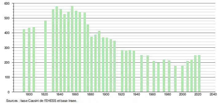 L'évolution du nombre d'habitants est connue à travers les recensements de la population effectués dans la commune depuis 1793. Pour les communes de moins de 10 000 habitants, une enquête de recensement portant sur toute la population est réalisée tous les cinq ans, les populations légales des années intermédiaires étant quant à elles estimées par interpolation ou extrapolation[29]. Pour la commune, le premier recensement exhaustif entrant dans le cadre du nouveau dispositif a été réalisé en 2006[30].