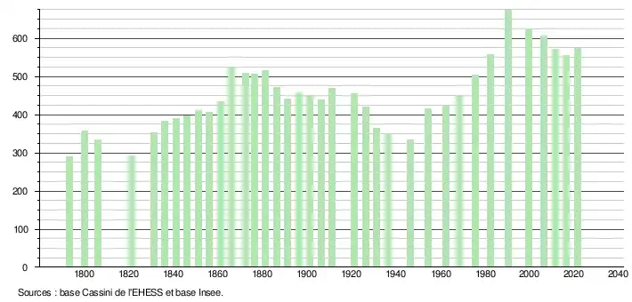 L'évolution du nombre d'habitants est connue à travers les recensements de la population effectués dans la commune depuis 1793. Pour les communes de moins de 10 000 habitants, une enquête de recensement portant sur toute la population est réalisée tous les cinq ans, les populations légales des années intermédiaires étant quant à elles estimées par interpolation ou extrapolation[14]. Pour la commune, le premier recensement exhaustif entrant dans le cadre du nouveau dispositif a été réalisé en 2006[15].