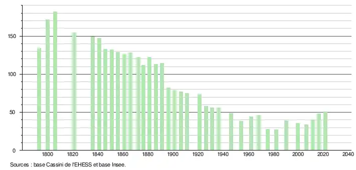 L'évolution du nombre d'habitants est connue à travers les recensements de la population effectués dans la commune depuis 1793. Pour les communes de moins de 10 000 habitants, une enquête de recensement portant sur toute la population est réalisée tous les cinq ans, les populations légales des années intermédiaires étant quant à elles estimées par interpolation ou extrapolation[13]. Pour la commune, le premier recensement exhaustif entrant dans le cadre du nouveau dispositif a été réalisé en 2006[14].