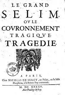 - Le Grand Selim, ou le couronnement tragique, tragédie. Paris Nicolas de Sercy, 1645. in-4°, 111 p. Consultable sur Gallica et sur Google Books.