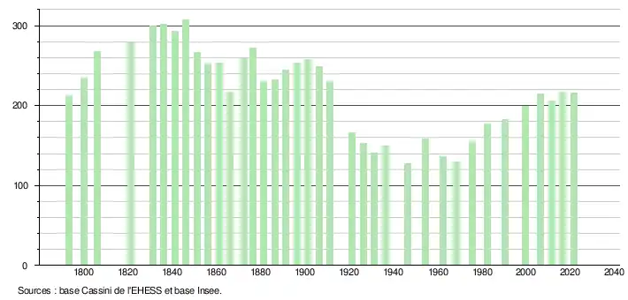 L'évolution du nombre d'habitants est connue à travers les recensements de la population effectués dans la commune depuis 1793. Pour les communes de moins de 10 000 habitants, une enquête de recensement portant sur toute la population est réalisée tous les cinq ans, les populations légales des années intermédiaires étant quant à elles estimées par interpolation ou extrapolation[19]. Pour la commune, le premier recensement exhaustif entrant dans le cadre du nouveau dispositif a été réalisé en 2006[20].
