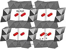Représentation polyédrique de la structure tunnel 2 x 3 de romanèchite. Les atomes rouges représentent le baryum et H2O[5].