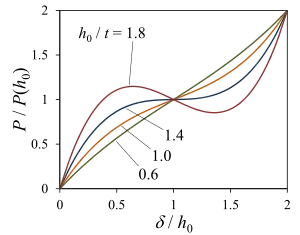 Cependant, il est possible de fabriquer des rondelles ayant des propriétés élastiques très différentes, comme le montrent les courbes charge-flèche ci-contre en fonction du rapport h0/t.