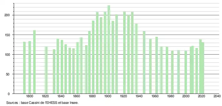 L'évolution du nombre d'habitants est connue à travers les recensements de la population effectués dans la commune depuis 1793. Pour les communes de moins de 10 000 habitants, une enquête de recensement portant sur toute la population est réalisée tous les cinq ans, les populations légales des années intermédiaires étant quant à elles estimées par interpolation ou extrapolation[26]. Pour la commune, le premier recensement exhaustif entrant dans le cadre du nouveau dispositif a été réalisé en 2008[27].