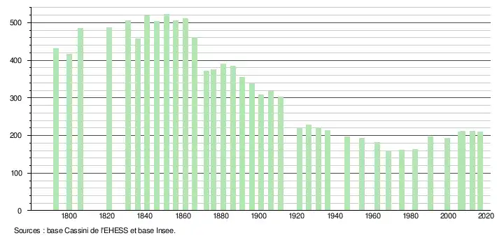 | L'évolution du nombre d'habitants est connue à travers les recensements de la population effectués dans la commune depuis 1793. Pour les communes de moins de 10 000 habitants, une enquête de recensement portant sur toute la population est réalisée tous les cinq ans, les populations légales des années intermédiaires étant quant à elles estimées par interpolation ou extrapolation[5]. Pour la commune, le premier recensement exhaustif entrant dans le cadre du nouveau dispositif a été réalisé en 2007[6]. En 2016, la commune comptait 210 habitants[Note 1], en diminution de 0,94 % par rapport à 2010 (Aude : +2,47 %, France hors Mayotte : +1,84 %). |