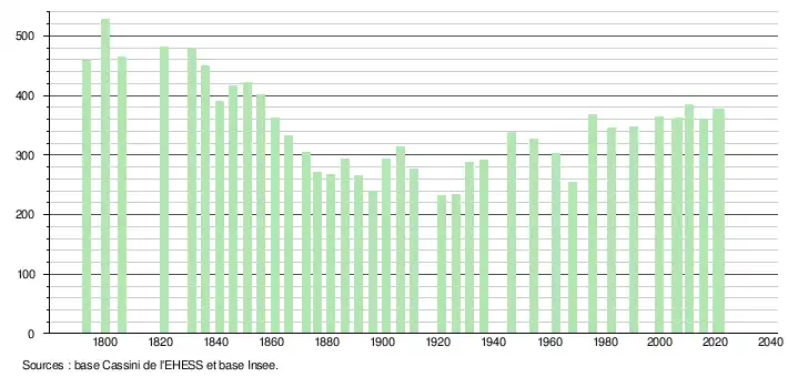 L'évolution du nombre d'habitants est connue à travers les recensements de la population effectués dans la commune depuis 1793. Pour les communes de moins de 10 000 habitants, une enquête de recensement portant sur toute la population est réalisée tous les cinq ans, les populations légales des années intermédiaires étant quant à elles estimées par interpolation ou extrapolation[19]. Pour la commune, le premier recensement exhaustif entrant dans le cadre du nouveau dispositif a été réalisé en 2005[20].