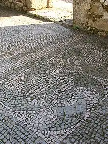 La zone absidale était complètement couverte d'un pavement à base de blocs taillés, qui par la présence des rares encore présents in situ, placés sur le pavement du local thermal, pourraient être attribués au temple de la terrasse sous-jacente. Cet état de fait est conforté par la présence sur le lieu d'éléments comportant des modénatures.