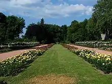 Le long des allées de l'axe central de longs parterres de rosiers sont particulièrement intéressants, car ils présentent plus de soixante-dix sortes de roses, typiques de l'époque de la RDA ('Dr Eckener', 'Rosenfest', une simple de couleur pourpre, 'Kristall', blanc, 'Dezent' qui est orangée, 'Hermann' et 'Komet' qui est orange-feu). Elles vont du jaune au rouge, en passant par l'orange, le vermillon, le rose et le blanc. On remarque la 'Baltik' de couleur lilas et des roses du début du XXe siècle comme 'New Dawn', ou 'Joseph Guy'. Plus récentes, La 'bonica 82' (Meilland) est de couleur rose, ainsi que 'The Fairy', tandis que la rosa hugonis est jaune, comme la 'Schloß Dryburg' ou la 'Wartburg'. Les moschata hybrides sont présentes, ainsi que des lambertianas et des multifloras. Il y a aussi d'anciens spéciments hybrides de Rosa rugosa, 'Hansa', et de Rosa canina 'Kiese', ainsi que 'Conrad Ferdinand Meyer'. Un pavillon ferme l'allée centrale au bout du jardin du milieu avec deux petites statues d'ours (Rudolf Löhners). Une petite partie à côté a été aménagée en 2002 avec différents types de delphinium elatum qui font l'admiration des promeneurs.