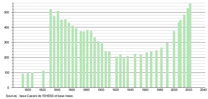 L'évolution du nombre d'habitants est connue à travers les recensements de la population effectués dans la commune depuis 1793. Pour les communes de moins de 10 000 habitants, une enquête de recensement portant sur toute la population est réalisée tous les cinq ans, les populations légales des années intermédiaires étant quant à elles estimées par interpolation ou extrapolation[22]. Pour la commune, le premier recensement exhaustif entrant dans le cadre du nouveau dispositif a été réalisé en 2008[23].