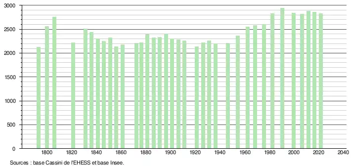 L'évolution du nombre d'habitants est connue à travers les recensements de la population effectués dans la commune depuis 1793. Pour les communes de moins de 10 000 habitants, une enquête de recensement portant sur toute la population est réalisée tous les cinq ans, les populations légales des années intermédiaires étant quant à elles estimées par interpolation ou extrapolation[26]. Pour la commune, le premier recensement exhaustif entrant dans le cadre du nouveau dispositif a été réalisé en 2006[27].