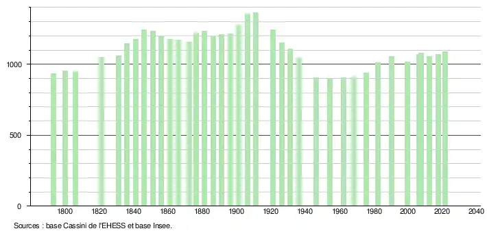 L'évolution du nombre d'habitants est connue à travers les recensements de la population effectués dans la commune depuis 1793. Pour les communes de moins de 10 000 habitants, une enquête de recensement portant sur toute la population est réalisée tous les cinq ans, les populations légales des années intermédiaires étant quant à elles estimées par interpolation ou extrapolation[28]. Pour la commune, le premier recensement exhaustif entrant dans le cadre du nouveau dispositif a été réalisé en 2007[29].