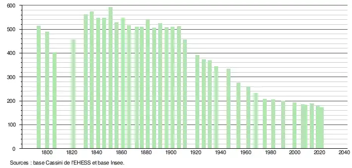 | L'évolution du nombre d'habitants est connue à travers les recensements de la population effectués dans la commune depuis 1793. Pour les communes de moins de 10 000 habitants, une enquête de recensement portant sur toute la population est réalisée tous les cinq ans, les populations légales des années intermédiaires étant quant à elles estimées par interpolation ou extrapolation[23]. Pour la commune, le premier recensement exhaustif entrant dans le cadre du nouveau dispositif a été réalisé en 2008[24]. En 2021, la commune comptait 173 habitants[Note 4], en diminution de 7,98 % par rapport à 2015 (Corrèze : −0,86 %, France hors Mayotte : +1,84 %). |