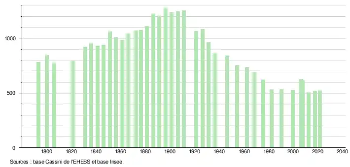 L'évolution du nombre d'habitants est connue à travers les recensements de la population effectués dans la commune depuis 1793. Pour les communes de moins de 10 000 habitants, une enquête de recensement portant sur toute la population est réalisée tous les cinq ans, les populations légales des années intermédiaires étant quant à elles estimées par interpolation ou extrapolation[33]. Pour la commune, le premier recensement exhaustif entrant dans le cadre du nouveau dispositif a été réalisé en 2007[34].