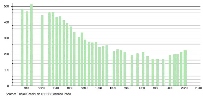 - Population municipale légale en vigueur au 1er janvier 2024, millésimée 2021, définie dans les limites territoriales en vigueur au 1er janvier 2023, date de référence statistique : 1er janvier 2021.