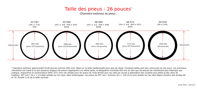 Une taille de 26 pouces pour les pneus (avec des chambres à air) est ce qu'il y a de plus courant pour la pratique du VTT en dehors des chemins goudronnés. Cela vient du fait que les pionniers du VTT utilisaient, pour leurs premiers vélos, des roues de vélos américains plutôt que des roues européennes qui étaient plus grandes. La jante typique de 26er a un diamètre de 559 mm (22pouces) et un pneu de diamètre externe d'environ 26,2 pouces (665 mm). Les pneus sans chambre à air qui se conforment à la norme UST (Universal System Tubeless) sont de plus en plus courants. Des kits sont également disponibles pour transformer des roues et des pneus non UST en roue sans chambre à air.