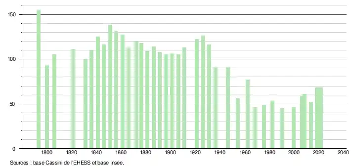 L'évolution du nombre d'habitants est connue à travers les recensements de la population effectués dans la commune depuis 1793. Pour les communes de moins de 10 000 habitants, une enquête de recensement portant sur toute la population est réalisée tous les cinq ans, les populations légales des années intermédiaires étant quant à elles estimées par interpolation ou extrapolation[26]. Pour la commune, le premier recensement exhaustif entrant dans le cadre du nouveau dispositif a été réalisé en 2008[27].