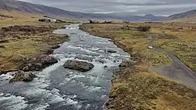 Route 48 (à l'extrême gauche sur la photo) dans la vallée de la rivière Laxá í Kjós