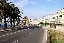 - Juste avant de tourner sur le port, un grand parking sur le quai Maxime Laubeuf. S'y trouve l'héligare pour accéder à l'héliport situé sur la jetée, avec des services réguliers d'hélicoptères vers Nice et Monaco ; et, temporairement en hiver, une grande fête foraine[58], pouvant même déborder sur la Route et en perturber la circulation[8].