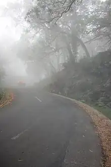 Vue de la route forestière du Maïdo sous un brouillard habituel.