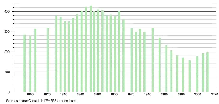 L'évolution du nombre d'habitants est connue à travers les recensements de la population effectués dans la commune depuis 1793. À partir du , les populations légales des communes sont publiées annuellement dans le cadre d'un recensement qui repose désormais sur une collecte d'information annuelle, concernant successivement tous les territoires communaux au cours d'une période de cinq ans. Pour les communes de moins de 10 000 habitants, une enquête de recensement portant sur toute la population est réalisée tous les cinq ans, les populations légales des années intermédiaires étant quant à elles estimées par interpolation ou extrapolation[5]. Pour la commune, le premier recensement exhaustif entrant dans le cadre du nouveau dispositif a été réalisé en 2006[6],[Note 1].