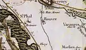 Au début des Temps modernes, l'abandon progressif de la châtellenie a pour conséquence une certaine négligence dans l'entretien des digues canalisant l'Ouche et l'Oucherotte. En 1594, ces dernières sont emportées et la plaine inondée. Les dégâts se renouvellent en 1612 ainsi qu'entre 1628 et 1630, puis encore en 1643[44]. Au XVIIe siècle, les terres sont progressivement achetées par de grosses fortunes dijonnaises qui trouvent un accord avec le nouveau seigneur en 1635. La communauté est alors en partie déchargée de la dette liée à la matroce. Pourtant, les ennuis ne sont pas terminés ! Pendant la guerre de Trente Ans qui oppose le Royaume de France à la Maison de Habsbourg, le général Gallas (1584-1647), envahisseur de la Bourgogne au profit du Duc de Lorraine, se dirige fin octobre 1636 vers Saint-Jean-de-Losne pour y mettre le siège. Secondé par le général Mercy, il est à la tête d'un corps de 10000 hommes. Il s'arrête à Rouvres et loge dans la maison de Monsieur de la Tournelle[45] qu'il avait fréquenté au manège de Strasbourg. Alors qu'un contingent français, dirigé par le Prince de Condé, s'avance par Fauverney, Gallas décide la retraite. Il ordonne à Mercy l'incendie du village (excepté la maison de la Tournelle) et du château. L'église est également endommagée : chœur abattu, clocher brûlé, cloches fondues et nef découverte[46]. Une source historique précise même que le château aurait été en grande partie détruit à coups de canons[47]. Trente années plus tard, en 1666, un terrible incendie détruit à nouveau le village. Pourtant, l'enquête de l'intendant Bouchu montre qu'une partie du château subsiste encore après cette date, dans un village réduit à 37 feux bien pauvres.