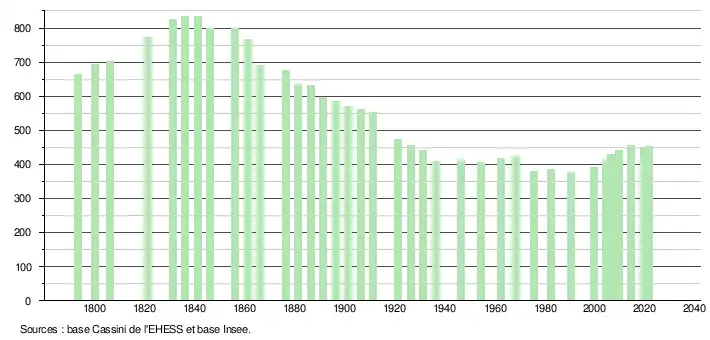 L'évolution du nombre d'habitants est connue à travers les recensements de la population effectués dans la commune depuis 1793. Pour les communes de moins de 10 000 habitants, une enquête de recensement portant sur toute la population est réalisée tous les cinq ans, les populations légales des années intermédiaires étant quant à elles estimées par interpolation ou extrapolation[25]. Pour la commune, le premier recensement exhaustif entrant dans le cadre du nouveau dispositif a été réalisé en 2004[26].