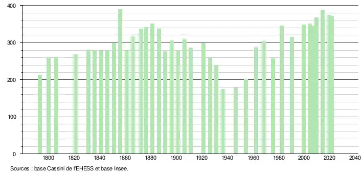 L'évolution du nombre d'habitants est connue à travers les recensements de la population effectués dans la commune depuis 1793. Pour les communes de moins de 10 000 habitants, une enquête de recensement portant sur toute la population est réalisée tous les cinq ans, les populations légales des années intermédiaires étant quant à elles estimées par interpolation ou extrapolation[15]. Pour la commune, le premier recensement exhaustif entrant dans le cadre du nouveau dispositif a été réalisé en 2004[16].