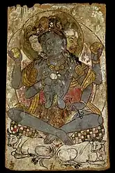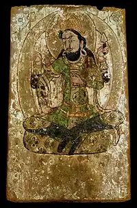 Peintures de l'artiste khotanais Viśa Īrasangä ou de son père Viśa Baysūna, VIIe siècle. Gauche: tableau d'une divinité indienne sur l'avers d'un panneau peint, représentant très probablement Shiva Droite: peinture d'une divinité perse au revers d'un panneau peint, représentant probablement le légendaire héros Rustam | ||