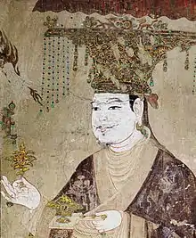 Après le retrait de la dynastie Tang, Khotan s'est allié avec les dirigeants de Dunhuang. Les royaumes bouddhistes de Dunhuang et Khotan avaient établi des relations étroites, cimentées par des mariages entre les familles royales des deux États. Une des conséquences concrètes de ces liens est le financement des grottes de Mogao et des temples bouddhistes de Dunhuang par les membres de la famille royale de Khotan, dont les portraits ornent les murs des grottes[52].