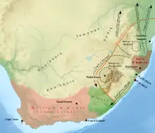 En , le chef des Voortrekkers, Piet Retief rend visite à Dingane dans son kraal royal, uMgungundlovu, pour négocier une terre pour les Voortrekkers. En novembre, environ mille chariots voortrekkers descendent des montagnes du Drakensberg dans ce qui est aujourd'hui le KwaZulu-Natal.