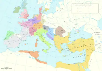 Au VIe siècle, les historiens de l'Empire d'Orient ont commencé à voir l'Empire d'Occident comme « perdu » au profit des barbares, plutôt que de décrire comment les rois barbares ont été mis en place par les Romains eux-mêmes ; un développement historiographique appelé « l'offensive idéologique justinienne » par les historiens modernes[26]. Bien que la naissance des royaumes barbares à la place de l'Empire occidental n'ait pas été un processus purement pacifique, l'idée d'« invasions barbares » mettant fin brutalement et violemment au monde de l'Antiquité, récit autrefois largement accepté parmi les historiens modernes, ne décrit pas de manière représentative la période. Attribuer la fin de l'Empire romain d'Occident aux "invasions barbares" ignore la diversité des nouveaux royaumes, considère les Barbares comme un bloc homogène et ignore le rôle de l'Empire dans son propre effondrement[27].